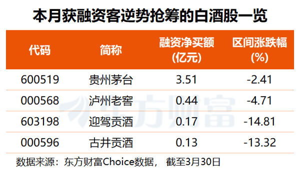 值得注意的是, 东方财富 Choice数据显示,有4只白酒股本月获得杠杆资金逆势加仓。其中,贵州茅台获融资客抢筹3.51亿元,泸州老窖融资净买额达4407万元, 迎驾贡酒 、 古井贡酒 均获超千万元融资净买入。