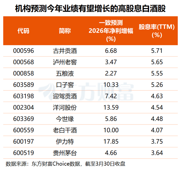 盈利预测方面,根据3家及以上机构一致预测,共有10只白酒股2026年净利润有望正增长且股息率(TTM)在3.5%以上。其中,机构预测 洋河股份 、 口子窖 、 老白干酒 、 伊力特 4股今年均有望实现两位数以上净利增长。