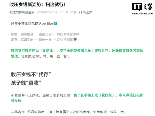 IT之家 2 月 15 日消息,微信支付官方今日发文,宣布推出针对儿童手表的“零花钱”功能, 支持小朋友使用儿童手表收取红包,还支持多名家长管理 ,轻松搞定“收、付、用、查、管”。