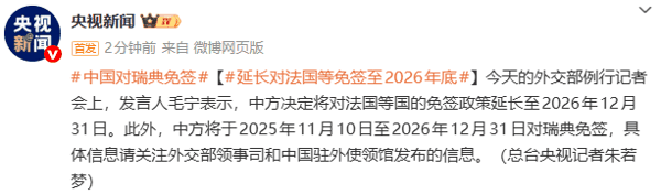 据央视新闻微博消息,今天的外交部例行记者会上,发言人毛宁表示,中方决定将对法国等国的免签政策延长至2026年12月31日。此外,中方将于2025年11月10日至2026年12月31日对瑞典免签,具体信息请关注外交部领事司和中国驻外使领馆发布的信息。
