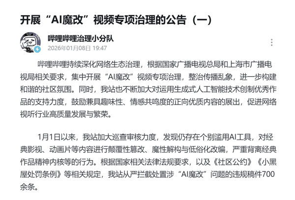哔哩哔哩平台拦截处置涉“AI 魔改”问题的违规稿件 700 余条。