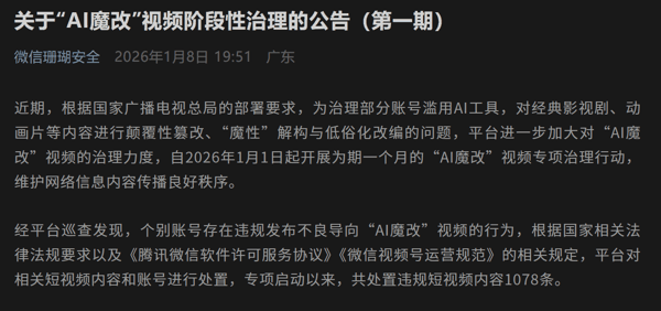 截至 2026 年 1 月 8 日,抖音平台累计处置涉“AI 魔改”违规视频 1075 条。