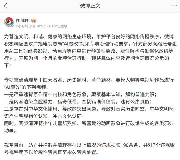 微博平台共拦截并清理违规视频 190 余条,并对 7 个违规账号视程度予以阶段性禁言直至永久禁言处置。