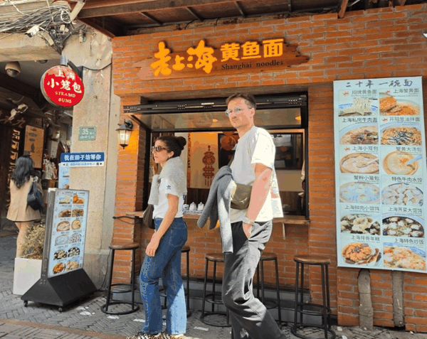 面馆不大,日均客单量在50单左右,最高峰时能突破100单。秦吉来观察到,店里90%以上的顾客是外国人,“韩国、日本、新加坡的都有,欧美游客也不少。”前段时间上海举办2026年F1中国大奖赛期间,店里排起了队,最长等了十几分钟。秦吉来告诉记者,外国食客的点单偏好各有不同——日韩游客偏爱蟹黄拌面和小笼包,欧美游客则更常点牛肉水饺。如今,他还能通过穿搭分辨外国游客的国籍。“日本的年轻女孩冬天也穿超短裙,买了隔壁‘布兰兔的植物庄园’茶叶的多半是韩国人,欧美游客不太买小商品,就是来吃面的。”