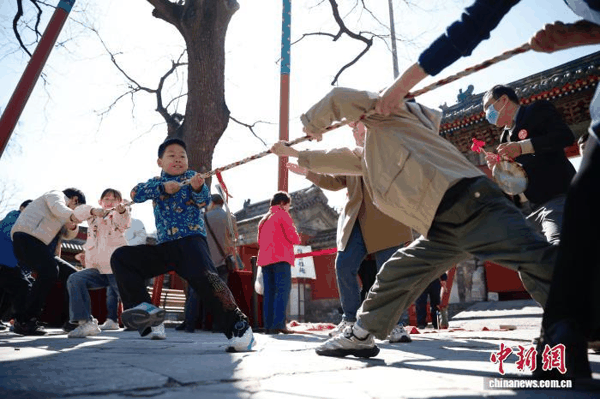 4月5日,“古礼映清明情思寄华夏”活动在北京民俗博物馆举办,市民现场体验戴柳纳福忆古承俗、手作青团忆寒食、非遗纸编风筝DIY、清明游艺拥抱自然四类传统项目。图为小朋友体验拔河。中新社记者韩海丹摄
