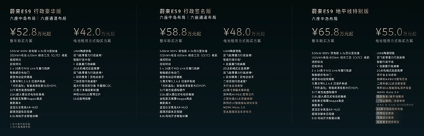 ES9 行政豪华版的整车售价是 52.8 万,如果选择 BaaS 电池租用方案,起售价直接来到了 42 万。