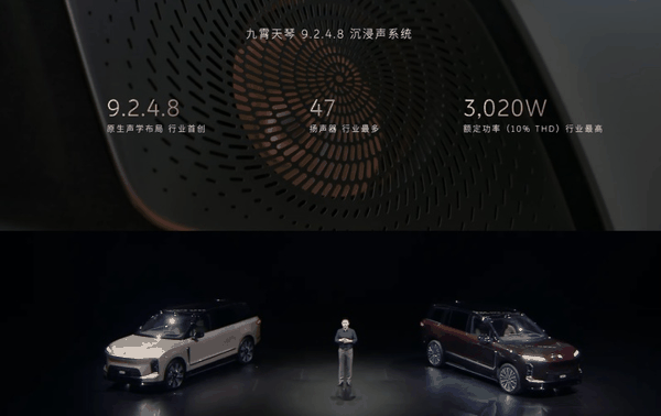 李斌在台上解释称,「9」代表九组全域环绕单元,「2」是沿着整车对角线对称布置的两枚超低音扬声器,「4」是车顶的四个天空扬声器,而「8」则是指前两排的八组共 16 个头枕扬声器。