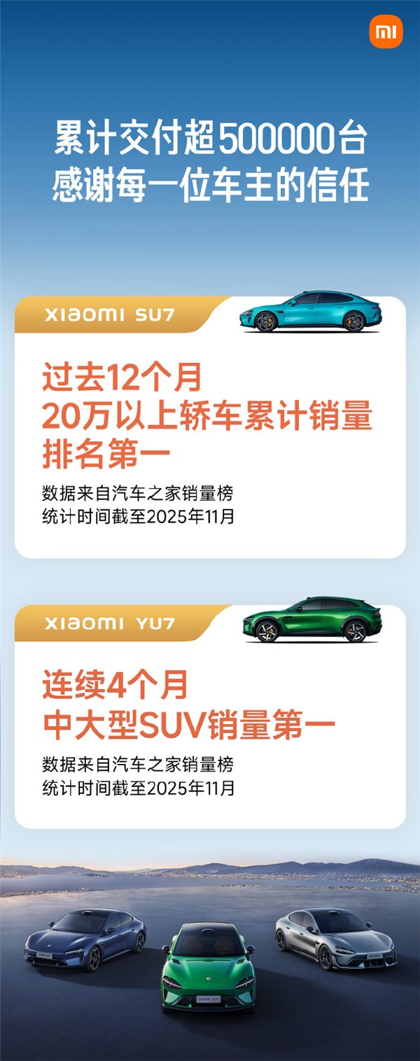 去年刚发布的小米 YU7 也不赖,连续 4 个月取得中大型 SUV 销量第一。两台车加起来,小米已经实现了累计交付超过 50 万台车,这几个数字大伙翻遍现在的中国车企也很难再找到一个。