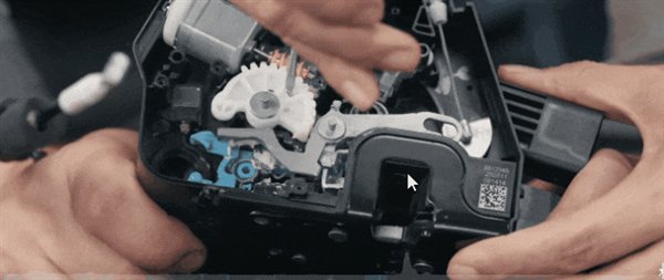 平时正常的时候,YU7 外部开门都是用电控解锁的,而在碰撞的一瞬间,YU7 会转换成机械开锁模式,棘轮瞬间卡上,外部也可以用机械方式打开。