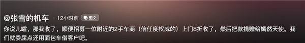 你说儿嚯,那我收了,顺便招募一位附近的2手车商(信任度权威的)上门8折收了,然后把款捐赠给嫣然天使,我们就委屈点还用面包车借客户吧 。