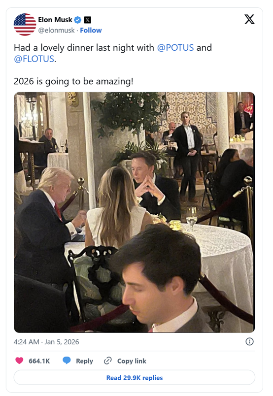 当地时间周日,马斯克在社交平台X上发文称,他昨晚(1月3日)与美国总统特朗普和美国第一夫人梅拉尼娅·特朗普“共进美好晚餐”,“2026 年将会非常精彩!”。