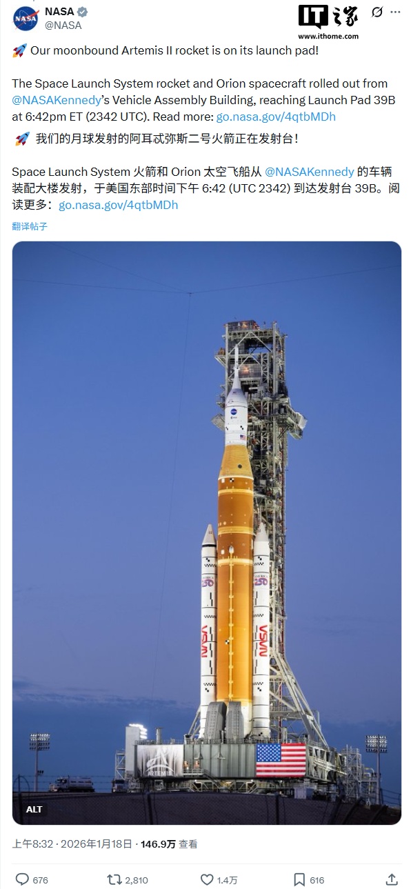 IT之家 1 月 18 日消息,经过近 12 小时的转运,执行美国“阿耳忒弥斯 2 号”载人绕月飞行任务的 SLS 火箭与猎户座飞船组合体已于当地时间 1 月 17 日下午 18:42 抵达肯尼迪航天中心 39B 发射台,标志着该任务进入最后的关键准备阶段。