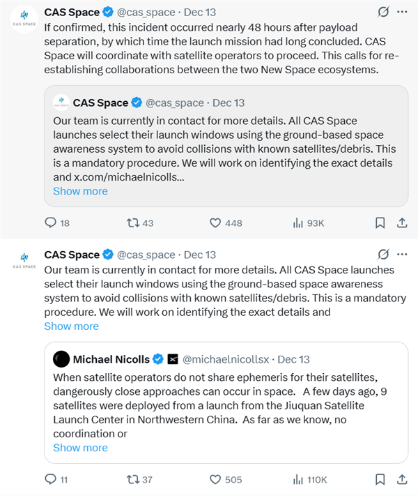 此番言论随即遭到前述发射服务提供商中科宇航的回击。中科宇航在社交媒体表示,其所有发射任务均会使用地面空间感知系统选择发射窗口,以避免与已知卫星或碎片发生碰撞,并强调这是一项强制性程序。