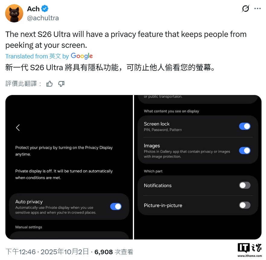 IT之家 1 月 2 日消息,科技媒体 SamMobile 昨天发布博文,曝光三星 Galaxy S26 系列手机的全新“隐私显示”(Privacy Display)功能, 可阻止他人从侧面偷窥机主的屏幕 。