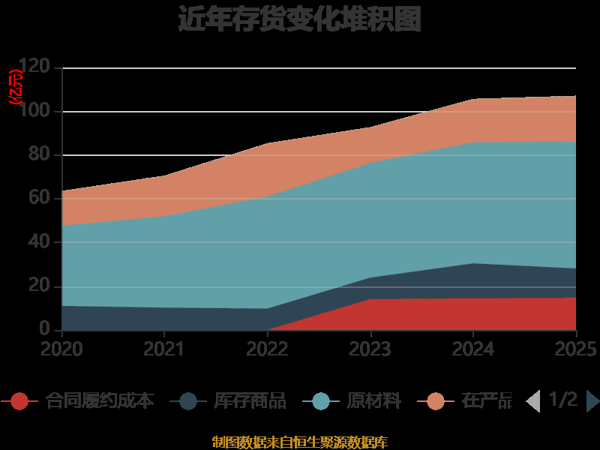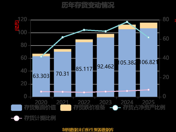 从存货变动来看,截至2025年末,公司存货账面价值为106.82亿元,占净资产的61.67%,较上年末增加1.44亿元。其中,存货跌价准备为8.39亿元,计提比例为7.28%。