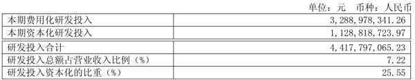 2025年全年,公司研发投入金额为44.18亿元,同比增长19.86%;研发投入占营业收入比例为7.22%,相比上年同期上升0.62个百分点。此外,公司全年研发投入资本化率为25.55%。