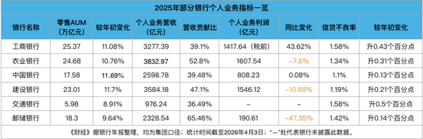 据《财经》梳理,在有可比数据的13家大中型银行里,有3家个人/零售业务在2025年营收贡献比超过一半,分别是邮储银行(65.46%)、招商银行(56.59%)、农业银行(52.8%);贡献比超过40%的还有建设银行(47.1%)、平安银行(46.9%)。