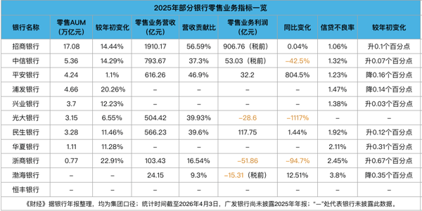 截至4月2日,多数大中型银行已披露2025年年报。从《财经》统计的6家国有银行和11家全国性股份制银行(截至发稿前,广发银行尚未披露)年报数据来看,零售AUM(资产管理规模)普遍上升,营收整体保持相对稳定,但零售 业 务利润 依然 承压 , 不良率多数走高。在已披露可比数据的12家银行中,3家零售业务亏损;6家利润同比负增,最高幅度达-1117%。