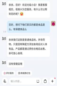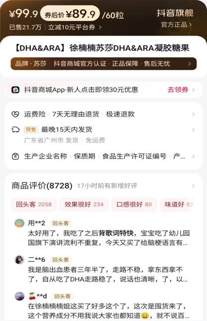 值得注意的是,在抖音商城中,多款普通食品的商品主页展示的评论,往往带有保健功效暗示,并且与保健功效相关内容还被以加粗字体突出显示。
