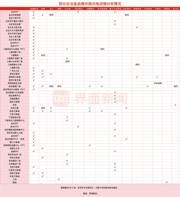 据界面新闻统计,截至4月上旬,老铺 黄金 在中国内地进驻了32家商场。这些商场中至少有19家都同时引入了其他古法金品牌。