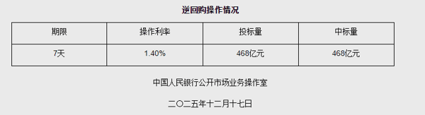中新网 12月17日电 据央行网站消息,2025年12月17日中国人民银行以固定利率、数量招标方式开展了468亿元7天期逆回购操作。具体情况如下: