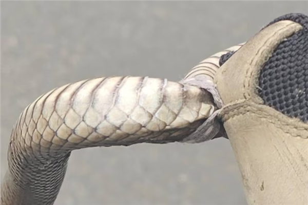 “这绝对是我处理过的最离奇案例,作为澳洲致死率最高、全世界危险性排第二的东部拟眼镜蛇,它居然自己钻进了鞋后跟的环里,牢牢卡死出不来了!”