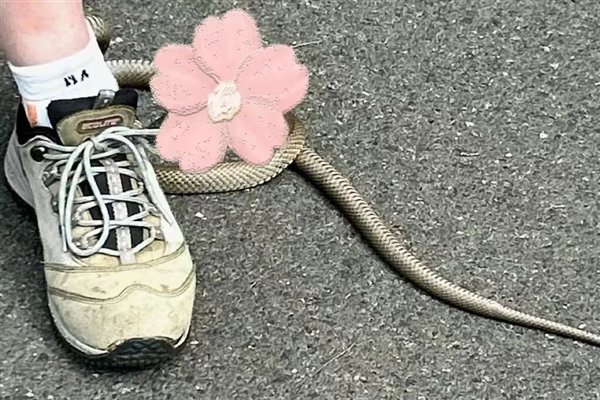 在搜寻灌木丛的时候,该女子突然觉得腿上好像有东西,于是从树丛中跳了出来,跑到路上用力抖腿,刚开始想着可能是被树叶缠住了,抖一抖就行了,没想到低头一看,鞋子上缠着一条蛇。