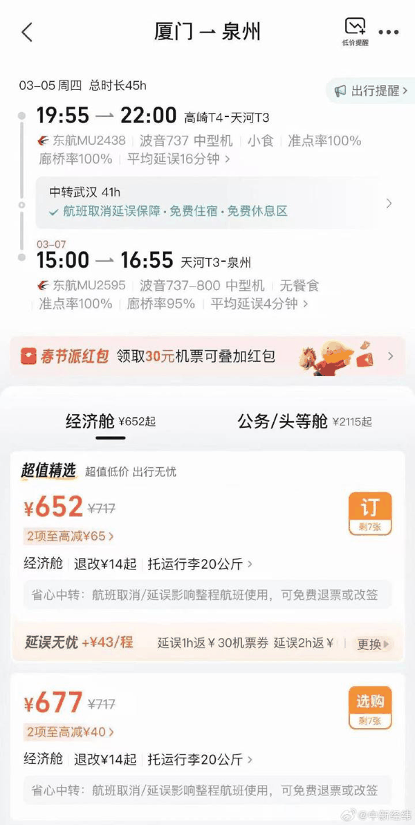 中新经纬查询发现,3月5日,广东揭阳飞深圳、中转湖北武汉的一趟航班,提供免费住宿、免费休息区、免费寄存等服务。免费住宿服务上,提供的是“一人一床位”的住宿条件。免费休息区上,提供的是免费使用武汉机场中转休息区。3月5日,福建厦门飞泉州、中转武汉的航班,也提供免费住宿、免费休息区、免费寄存等服务,形式上与前述航班类似。