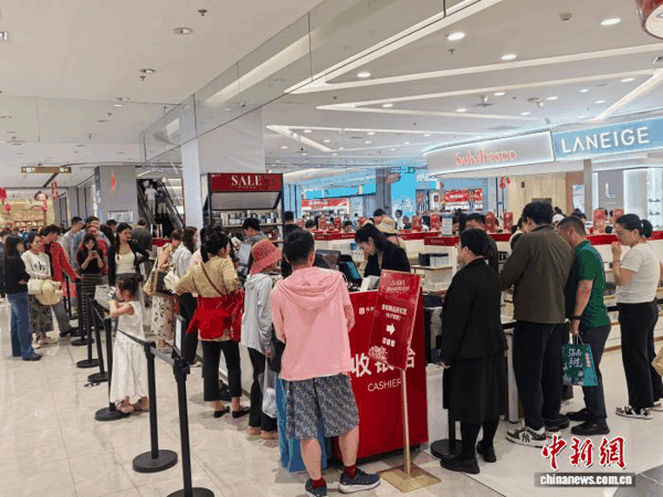 2月18日,三亚海旅免税城内,消费者排队买单。(三亚海旅免税城 供图)