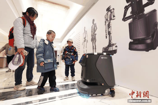 11月29日,首届北京智慧酒店机器人“揭榜挂帅”应用大赛在北京亦庄举行。图为一台比赛中的扫地机器人吸引小朋友。 记者 张祥毅 摄