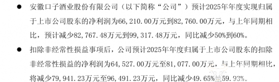 公告显示,口子窖预计2025年年度实现归母净利润6.62亿元到8.28亿元,与上年同期相比预计减少8.28亿元到9.93亿元,同比下降50%到60%。同时,扣非归母净利润预计为6.45亿元至8.11亿元,相较于去年同期预计下降7.99亿元至9.65亿元,同比减少49.65%至59.93%。