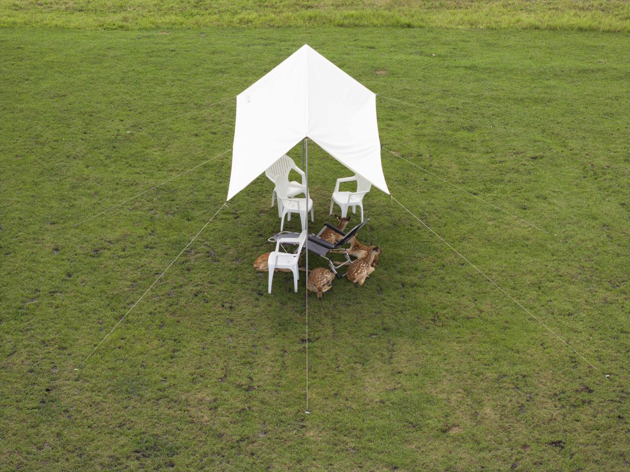 从 2022 年至今,杭添一直在用无人机拍摄中国人的露营热潮。他的拍摄以江浙地区为 圆 心,覆盖全国多地,记录了发生在公共绿地、城市公园、专业营地等多元空间中的露营场景。不出所料,绿油油的草地上遍布帐篷的场景成为这一系列作品的标志性图像,但仔细端详, 能在这些乍看之下复杂纷乱的照片中发现许多 令人 玩味 的细节。