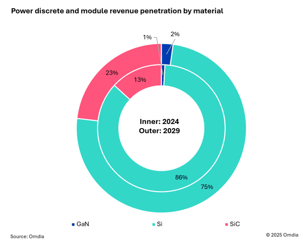 尽管硅基半导体目前仍占据市场主导地位,但受汽车与工业等主要应用领域面临的挑战影响,其市场表现正逐步走弱。相比之下,宽禁带半导体展现出强劲增长势头,预计在2029年前将持续保持高增速,并有望在2026年贡献超过总营收的20%。其中,碳化硅(SiC)在电动汽车动力系统中的应用持续拓展,虽同比增速略有放缓,但仍维持强劲需求;而氮化镓(GaN)虽然当前市场规模相对较小,但随着数据中心对高效能、高功率密度电源解决方案的需求不断上升,预计将成长为下一阶段的核心增长驱动力。