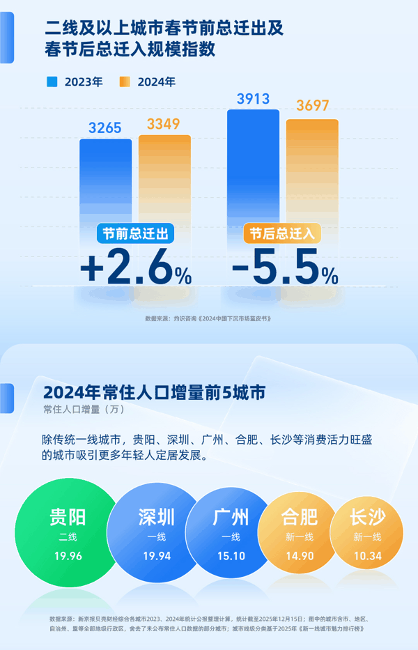 根据《报告》及新京报贝壳财经记者整理的2023—2024年城市常住人口数据变化,截至2025年12月15日,全国已公布数据的城市中,有超过130个城市实现人口净增长,7个城市常住人口增长超过10万人;常住人口增量排名前三十的城市中,二线及以下城市达到17个。2024年,贵阳常住人口较上年增加近20万人,是当年增长规模最大的城市,增长体量与深圳相当。