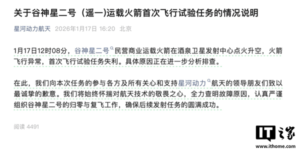 IT之家 1 月 17 日消息,今天下午,星河动力航天发布关于谷神星二号(遥一)运载火箭首次飞行试验任务的情况说明: