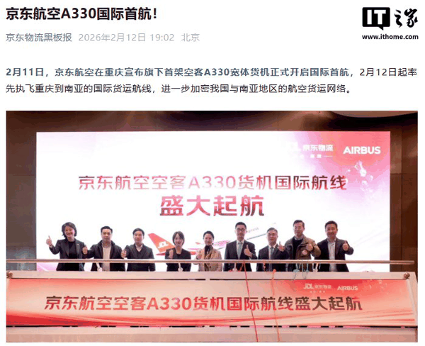 IT之家 2 月 13 日消息,据京东物流黑板报,2 月 11 日,京东航空在重庆宣布旗下首架空客 A330 宽体货机正式开启国际首航,2 月 12 日起率先执飞重庆到南亚的国际货运航线,进一步加密我国与南亚地区的航空货运网络。