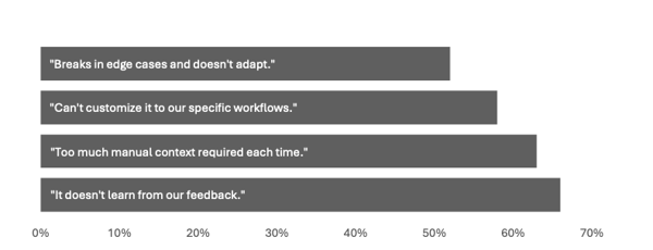 报告一针见血地指出,这些工具失败的核心原因在于它们缺乏「学习能力」。大多数企业级AI系统无法保留用户反馈、无法根据上下文自适应,也无法随着时间灵活变化。