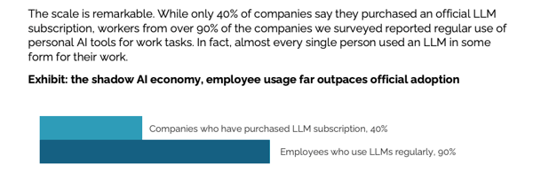 老实说,也不意外。但与此同时,这份报告也发现了另一个有趣现象: 超过九成的员工在背地里使用个人AI工具来提高工作效率。