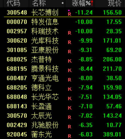 下跌方面,CPO等算力硬件股调整, 长芯博创 跌超10%。