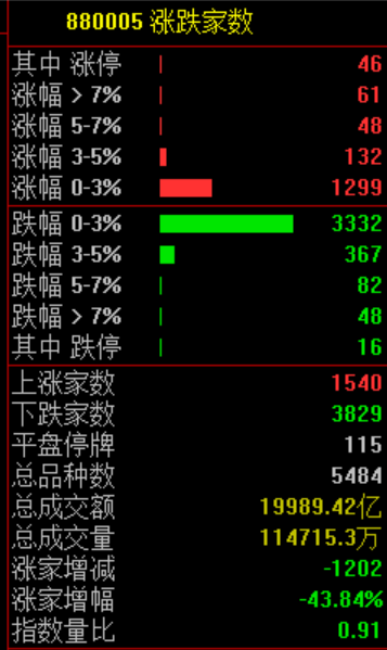 市场共1540只个股上涨,46只个股涨停,3829只个股下跌。