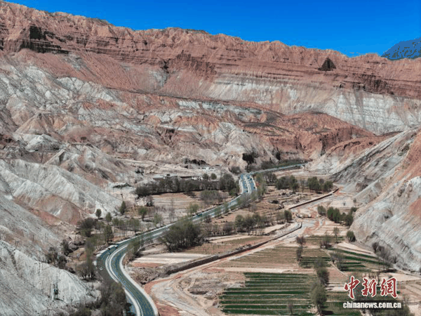 资料图为航拍青海贵德丹霞地貌间的公路。 马铭言 摄