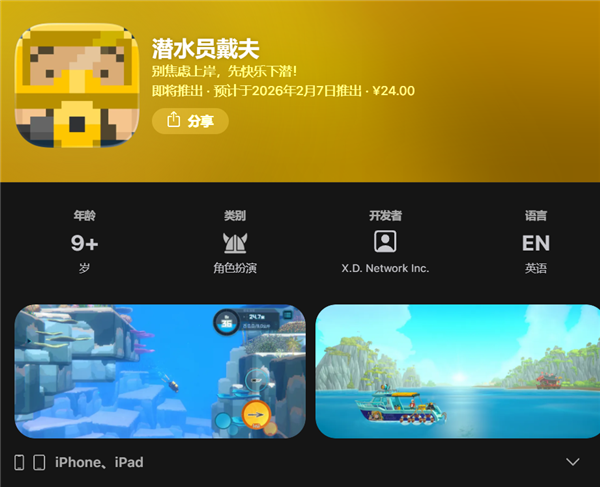 《潜水员戴夫》国服手机版首发折扣价24元(原价30元), 目前已在苹果App Store上架,苹果用户可提前预订。