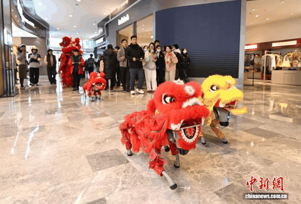 舞狮机器狗在杭州某商圈巡游。 王刚 摄