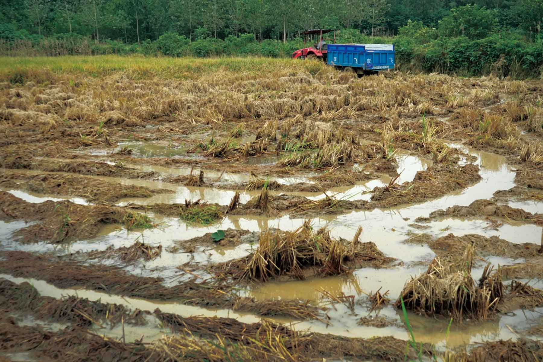 2025年10月10日,河南省南阳市桐柏县,一辆拖拉机载着刚刚收割的稻子离开稻田。由于持续的阴雨,田里积水严重,稻田被车轮碾过后变得沟壑纵横 (中青报·中青网记者 李强/图)