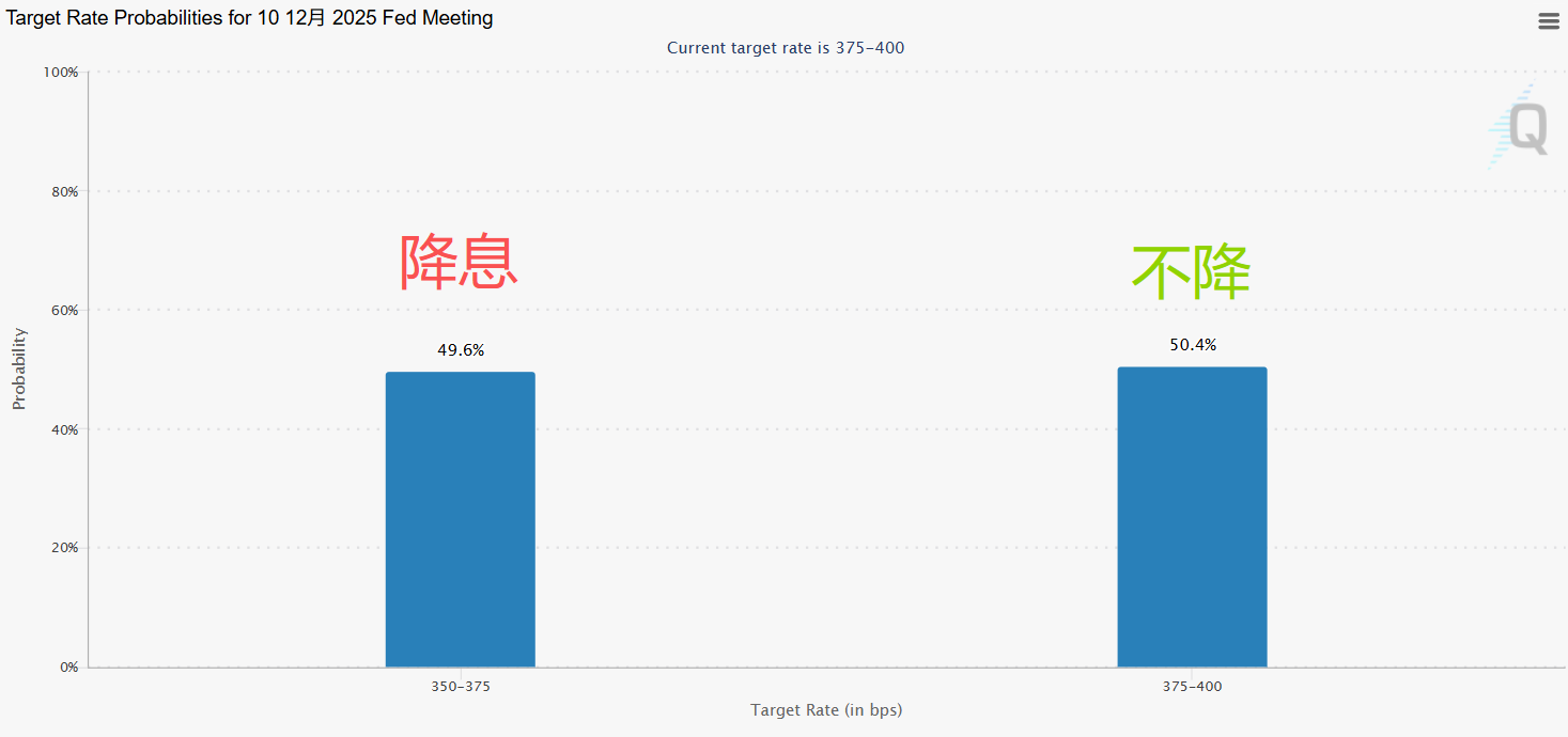 美股市场方面,随着一连串美联储官员对是否需要连续三次降息表达怀疑, “美联储观察”反映的掉期市场定价已经将12月9-10日降息的概率调整至“五五开” ,而一个月前,12月降息的预测概率还是95%。周五也有三位美联储官员将发表讲话,其中包括今年有投票权的施密德。