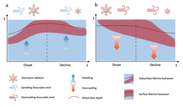 海洋热浪,可类比为“水中的热浪”,是指海水温度在一段时间内显著高于气候平均值的现象。长期以来,学界普遍认为沿岸上升流系统可能是抵御海洋热浪的“冷庇护所”。上升流由季风或沿岸风驱动,能将深层冷水输送至表层,在一定程度上抵消海水变暖效应。然而,上升流与海洋热浪究竟如何相互作用?上升流能否真正“限制”海洋热浪向更深层发展?这些问题此前缺乏系统的定量研究。
