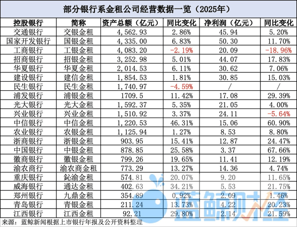 蓝鲸新闻整理了21家已披露数据的 银行 系金租公司经营情况。在支持实体经济、服务设备更新的政策东风下,2025年银行系金租公司整体保持扩张态势,经营业绩亦普遍实现了增长。