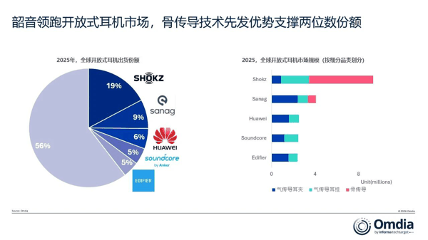 开放式耳机市场持续扩张。Omdia数据显示,到2025 年,开放式产品占全球个人音频市场10%以上,年出货量超过3000万台。随着品类规模扩大,产品策略与竞争格局正经历结构性调整。