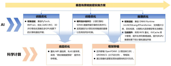 在垂直场景赋能层,MACA 针对 AI 与科学计算两大方向,通过针对性的优化策略与框架适配解决需求。