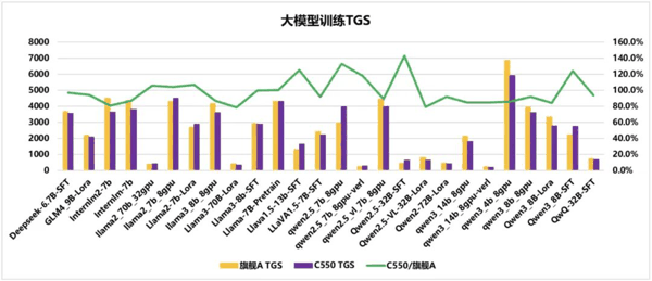 DeepSeek、GLM、InternLM、Llama、Qwen 等多系列大模型,在不同参数规模(如 7B、13B)及任务类型(SFT、Pretrain)下的训练 TGS 数据,包含 「 旗舰 A TGS 」 (黄色柱)、 「 C550 TGS 」 (紫色柱)及两者效率比值(绿色折线)。